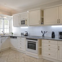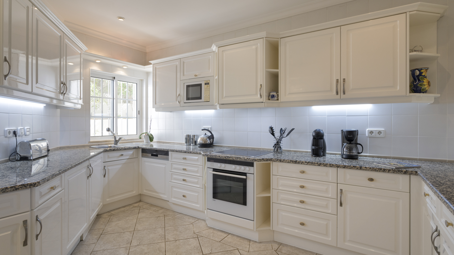 Cozinha espaçosa e totalmente equipada com aparelhos integrados, incluindo frigorífico, máquina de lavar e secar roupa, máquina de lavar louça, microondas, fogão eléctrico com exaustor e forno. A cozinha tem uma área de serviço para a sala de jantar.